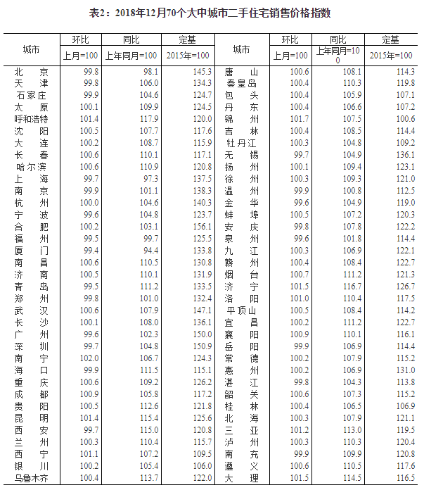 2018年12月份70個大中城市商品住宅銷售價格變動情況