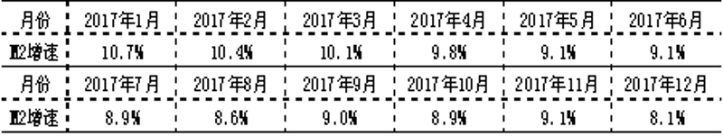 注2:2018年1月,人民銀行完善貨幣供應(yīng)量中貨幣市場基金部分的統(tǒng)計方法,用非存款機(jī)構(gòu)部門持有的貨幣市場基金取代貨幣市場基金存款(含存單)。完善后,2017年各月末M2增速如下: