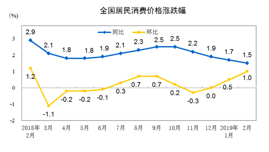 2019年2月份居民消費價格同比上漲1.5%