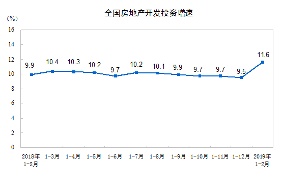 2019年1-2月份,全國房地產開發投資12090億元,同比增長11.6%,增速比2018年全年提高2.1個百分點。其中,住宅投資8711億元,增長18.0%,增速提高4.6個百分點。住宅投資占房地產開發投資的比重為72.1%。