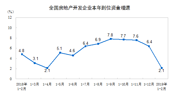 1-2月份,房地產開發企業到位資金24497億元,同比增長2.1%,增速比2018年全年回落4.3個百分點。其中,國內貸款4976億元,下降0.5%;利用外資52億元,增長3.3倍;自籌資金7279億元,下降1.5%;定金及預收款7366億元,增長5.6%;個人按揭貸款3458億元,增長6.5%。