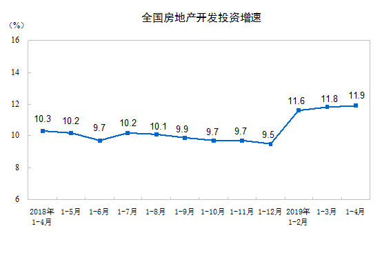 2019年1—4月份,全國房地產開發(fā)投資34217億元,同比增長11.9%,增速比1—3月份提高0.1個百分點。其中,住宅投資24925億元,增長16.8%,增速回落0.5個百分點。住宅投資占房地產開發(fā)投資的比重為72.8%。