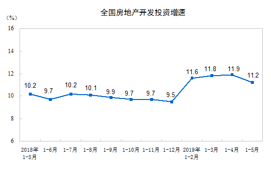 2019年1—5月份,全國房地產開發投資46075億元,同比增長11.2%,增速比1—4月份回落0.7個百分點。其中,住宅投資33780億元,增長16.3%,增速回落0.5個百分點。住宅投資占房地產開發投資的比重為73.3%。