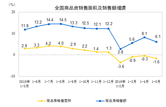 1—5月份,商品房銷售面積55518萬平方米,同比下降1.6%,降幅比1—4月份擴大1.3個百分點。其中,住宅銷售面積下降0.7%,辦公樓銷售面積下降12.2%,商業營業用房銷售面積下降12.9%。商品房銷售額51773億元,增長6.1%,增速回落2個百分點。其中,住宅銷售額增長8.9%,辦公樓銷售額下降12.3%,商業營業用房銷售額下降9.7%。
