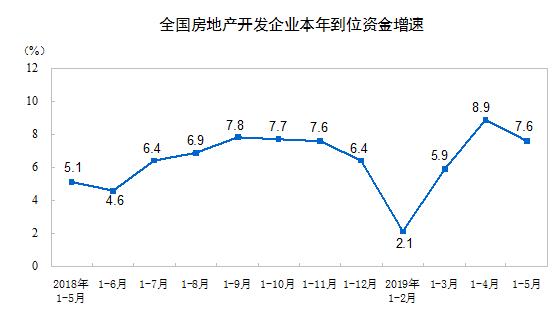 1—5月份,房地產開發企業到位資金66689億元,同比增長7.6%,增速比1—4月份回落1.3個百分點。其中,國內貸款10762億元,增長5.5%;利用外資30億元,增長38.8%;自籌資金20276億元,增長4.1%;定金及預收款22395億元,增長11.3%;個人按揭貸款10251億元,增長10.8%。