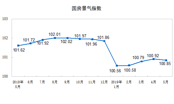 5月份,房地產開發景氣指數(簡稱“國房景氣指數”)為100.85,比4月份回落0.07點。