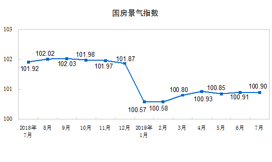 7月份,房地產(chǎn)開(kāi)發(fā)景氣指數(shù)(簡(jiǎn)稱“國(guó)房景氣指數(shù)”)為100.90,比6月份回落0.01點(diǎn)。