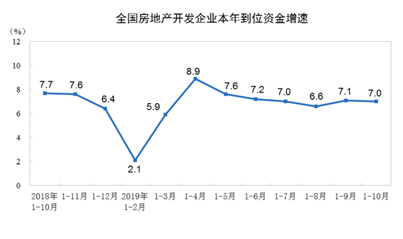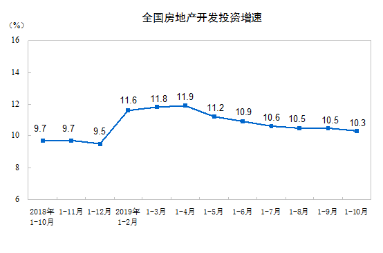 2019年1—10月份,全國房地產開發投資109603億元,同比增長10.3%,增速比1—9月份回落0.2個百分點。其中,住宅投資80666億元,增長14.6%,增速回落0.3個百分點。