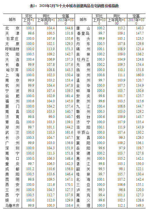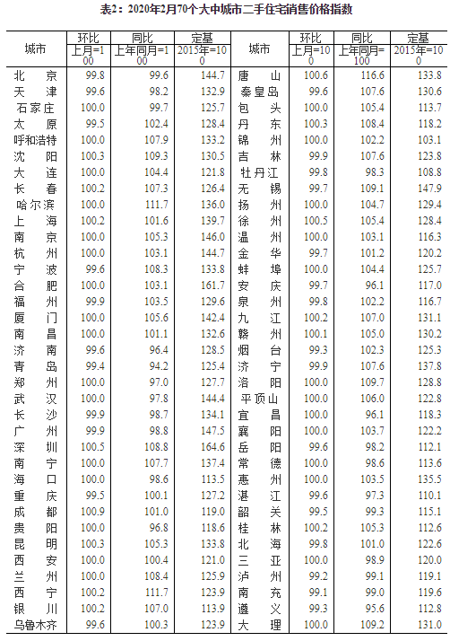 2020年2月份70個大中城市商品住宅銷售價格變動情況