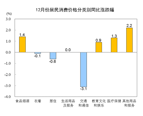 2020年12月份,全國居民消費價格同比上漲0.2%。其中,城市上漲0.2%,農村上漲0.2%;食品價格上漲1.2%,非食品價格持平;消費品價格上漲0.2%,服務價格上漲0.3%。