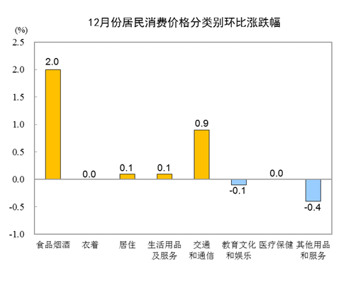 12月份,全國居民消費價格環比上漲0.7%。其中,城市上漲0.7%,農村上漲0.9%;食品價格上漲2.8%,非食品價格上漲0.1%;消費品價格上漲1.2%,服務價格持平。