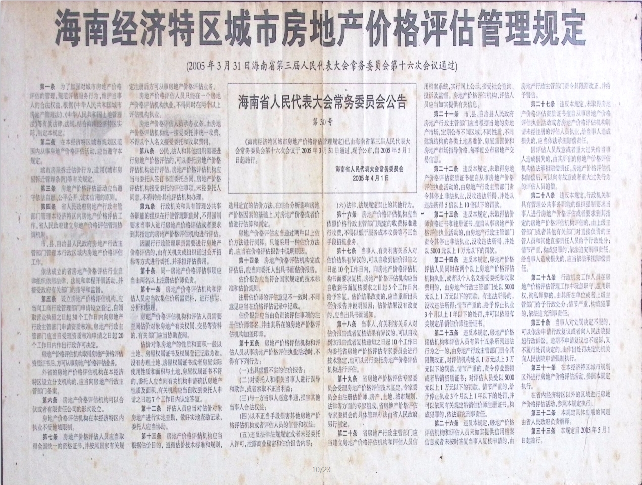 (三)2005年3月31日,海南省第三屆人民代表大會常務(wù)委員會第16次會議通過《海南經(jīng)濟特區(qū)城市房地產(chǎn)價格評估管理規(guī)定》,開創(chuàng)全國首個房地產(chǎn)評估地方立法先河。