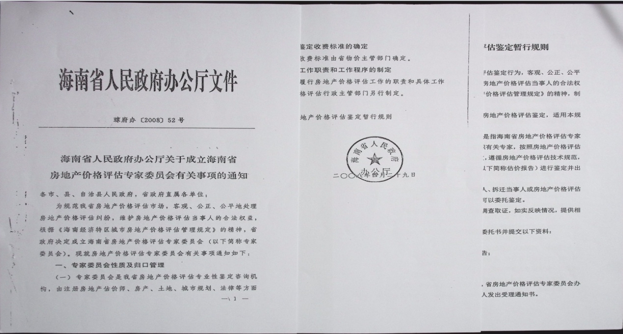 (四)2008年4月29日,海南省人民政府辦公廳發(fā)布《關(guān)于成立海南省房地產(chǎn)價格評估專家委員會有關(guān)事項的通知》(瓊府辦[2008]52號),同時發(fā)布《海南省房地產(chǎn)價格評估鑒定暫行規(guī)則》,2009年海南省住房和城鄉(xiāng)建設(shè)廳正式成立海南省房地產(chǎn)價格評估專家委員會,進一步規(guī)范了海南房地產(chǎn)評估市場,依法客觀、公平、公正處理房地產(chǎn)價格評估糾紛,有效維護房地產(chǎn)價格評估當事人的合法權(quán)益。