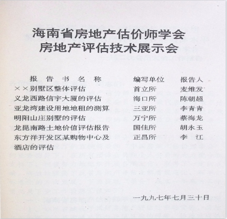 1.1997年7月30日,開展海南省房地產(chǎn)估價師學會房地產(chǎn)評估技術(shù)展示會,有6個房地產(chǎn)評估機構(gòu)帶著各自的評估報告進行相互交流學習。