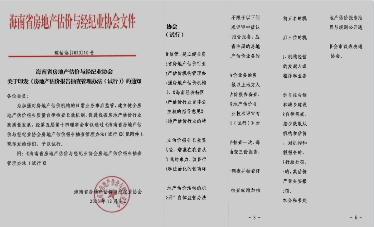 3.2023年12月7日,為加強對房地產(chǎn)估價機構(gòu)日常業(yè)務(wù)事后監(jiān)管,建立健全房地產(chǎn)估價報告質(zhì)量自律檢查長效機制,促進海南房地產(chǎn)估價行業(yè)高質(zhì)量發(fā)展,海南協(xié)會出臺《房地產(chǎn)估價報告抽查管理辦法(試行)》等規(guī)定。