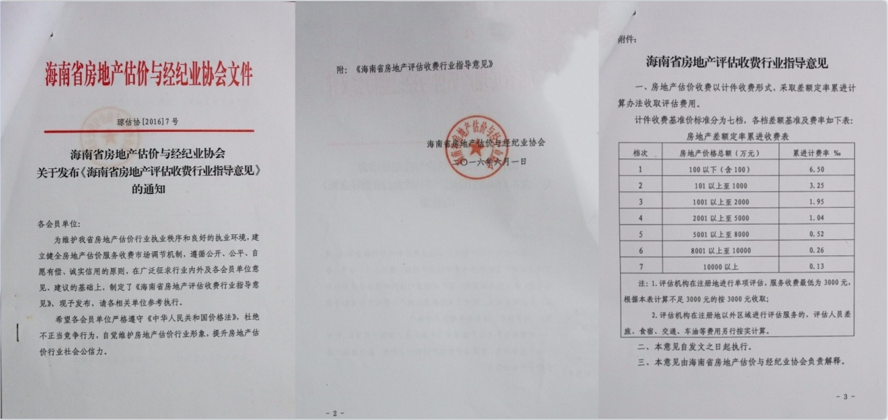2016年6月1日,發(fā)布《海南省房地產(chǎn)評估收費行業(yè)指導(dǎo)意見》,沿用至今。