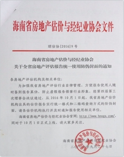 為方便房地產(chǎn)估價報告使用人鑒別報告真?zhèn)危乐固摷賵蟾鎿p害行業(yè)形象,海南協(xié)會發(fā)布《關(guān)于全省房地產(chǎn)評估報告統(tǒng)一使用防偽封面的通知》,從2016年10月1日起,海南房地產(chǎn)估價機構(gòu)出具的估價報告實行統(tǒng)一格式和具備二維碼查詢方式的防偽封面,基本杜絕了虛假報告存在,受到行業(yè)及社會好評,同時也通過《海南日報》進行宣傳報道,培養(yǎng)市場主動查詢報告真?zhèn)蔚牧晳T。