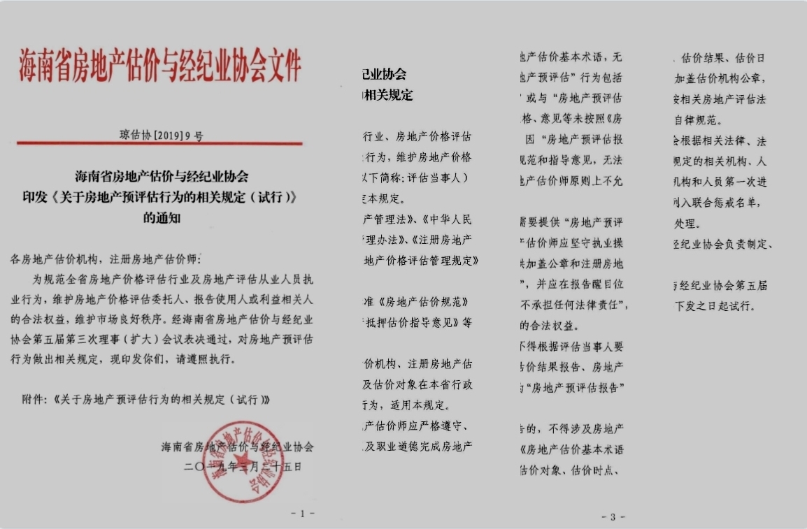 2019年3月25日,為規(guī)范海南房地產(chǎn)價格評估行業(yè)及房地產(chǎn)評估從業(yè)人員執(zhí)業(yè)行為,維護房地產(chǎn)價格評估委托人、報告使用人或利益相關(guān)人的合法權(quán)益,維護市場良好秩序,海南協(xié)會發(fā)布《關(guān)于房地產(chǎn)預(yù)評估行為的相關(guān)規(guī)定(試行)》等評估技術(shù)規(guī)范指引,主動自律規(guī)范房地產(chǎn)估價行為。