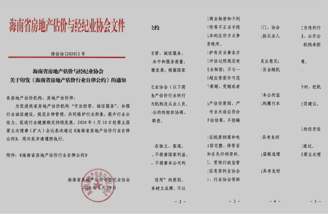 2020年1月10日,在海南省住房和城鄉(xiāng)建設(shè)廳和海南省消費者委員會見證下,向社會公開發(fā)布《海南省房地產(chǎn)估價行業(yè)自律公約》,詳細規(guī)定了房地產(chǎn)評估機構(gòu)和從員人員的自律約定、監(jiān)督檢查、違約處理等行規(guī)行約,行業(yè)自律管理主動作為,對估價機構(gòu)和估價從業(yè)人員起到了較好的自律監(jiān)督、自律管理作用。