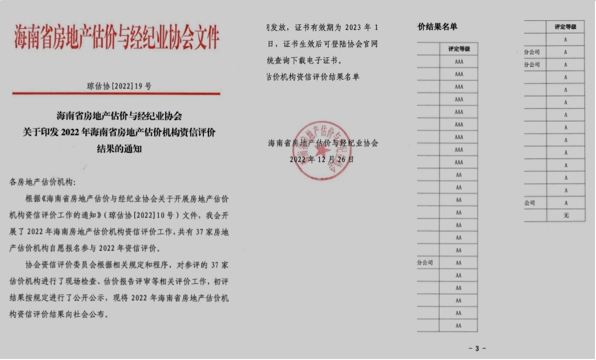 2022年海南首次開展房地產(chǎn)估價機構(gòu)資信評價活動,共有37家估價機構(gòu)自愿報名參與評價,評出AAA資信機構(gòu)9家,AA資信機構(gòu)13家,A資信機構(gòu)13家。主動加強行業(yè)的自律管理,為社會擇優(yōu)選用估價機構(gòu)提供參考。