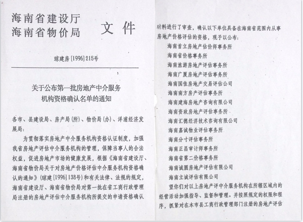 1996年,海南省建設(shè)廳、海南省物價局公布第一批房地產(chǎn)評估機構(gòu)名單,海南房地產(chǎn)估價行業(yè)步入規(guī)范化發(fā)展階段。