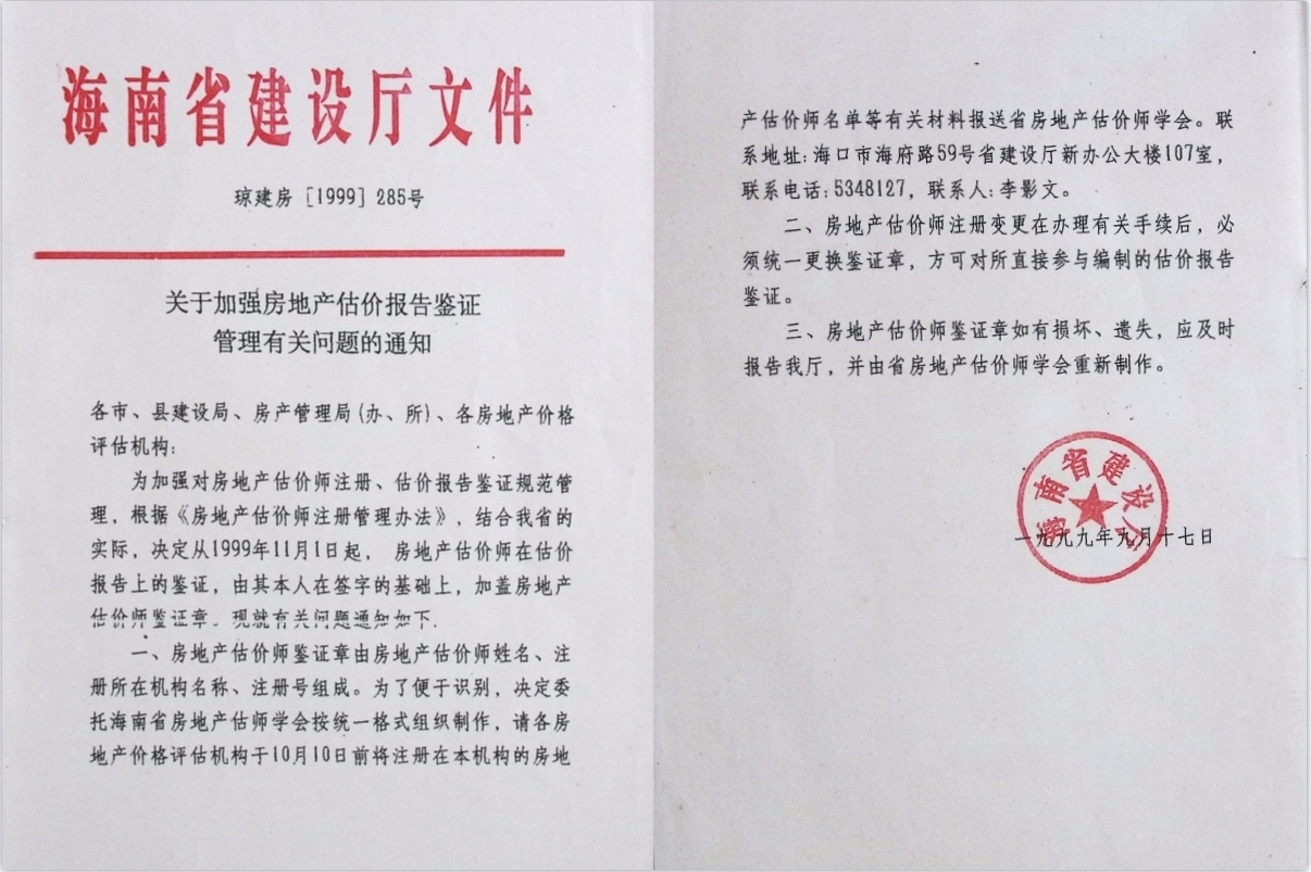 (一)1999年11月1日,海南省建設(shè)廳為加強對房地產(chǎn)估價師注冊、估價報告鑒證規(guī)范管理,要求房地產(chǎn)估價師在估價報告上的簽證,由其本人在簽字的基礎(chǔ)上,統(tǒng)一加蓋房地產(chǎn)估價師簽證章,房地產(chǎn)估價師鑒證章包含房地產(chǎn)估價師姓名、注冊所在機構(gòu)名稱、注冊號等信息,該項規(guī)定一直沿用至今。