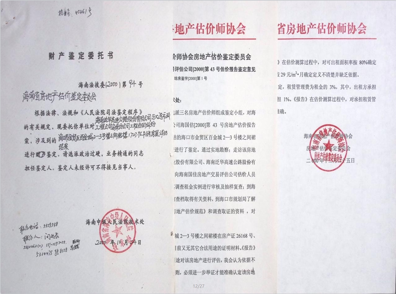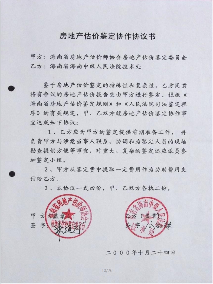 (二)2000年6月30日,為更好地解決估價糾紛,海南省建設(shè)廳同意設(shè)立海南省房地產(chǎn)估價鑒定委員會,受理政府主管部門、法院、估價糾紛當事人的委托,對房地產(chǎn)估價進行復(fù)核、鑒定,調(diào)查處理估價糾紛。同時也正式與司法部門簽訂鑒定協(xié)作協(xié)議,逐步完善房地產(chǎn)的評估、房地產(chǎn)評估鑒定體系,滿足社會特別是司法部門對房地產(chǎn)評估和房地產(chǎn)評估糾紛解決的需求。